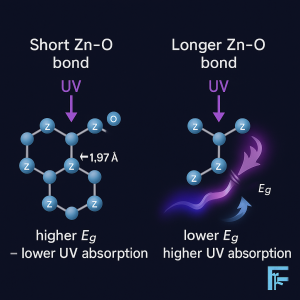 Variations in Zn–O bond length, influenced by laser irradiation or doping, can modulate the bandgap and shift UV-absorption peaks of ZnO nanoparticles. A slight increase in bond length tends to lower the bandgap, enhancing UV absorption in the 250–400 nm range. This fine-tuning offers valuable control over optical properties for UV-filtering applications in agrochemistry.