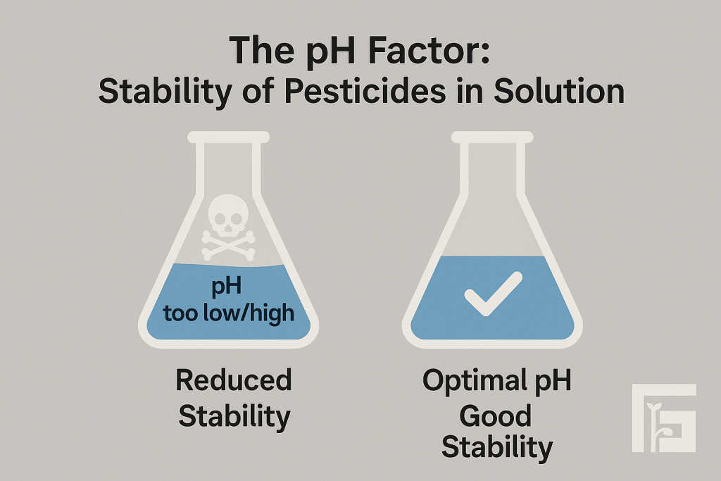 Pesticide stability is heavily influenced by spray solution pH; for example, the fungicide fluazinam remains stable at acidic pH (pH 4) but degrades rapidly at neutral to alkaline pH (pH 7–9). This shift in stability affects half-life and field efficacy. Adjusting water pH to appropriate levels is essential to preserve pesticide performance and consistency.