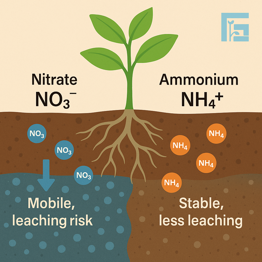 Nitrogen in soil primarily exists as nitrate (NO₃⁻) and ammonium (NH₄⁺). Nitrate is mobile, easily leached, and quickly available to plants but prone to losses. Ammonium, on the other hand, binds to soil particles, releases slowly, and reduces leaching risks. Balancing these two forms is crucial for efficient fertilization and sustainable crop yields.