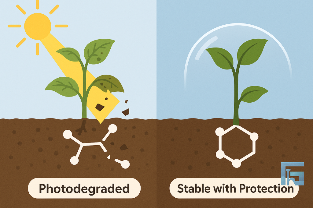 Photodegradation is the breakdown of pesticide molecules under sunlight, often leading to rapid loss of field efficacy. UV light excites chemical bonds, causing them to split and form less active or inactive products. Understanding photodegradation helps in choosing stable formulations, applying sprays at the right time, and developing UV-protective additives for longer-lasting protection.