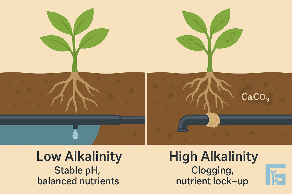 Alkalinity in irrigation water, mainly from bicarbonates (HCO₃⁻) and carbonates (CO₃²⁻), affects pH stability and nutrient availability. High alkalinity can cause precipitation of calcium and magnesium, leading to clogged irrigation systems and reduced fertilizer efficiency. Managing alkalinity is critical to maintain soil balance and crop performance.