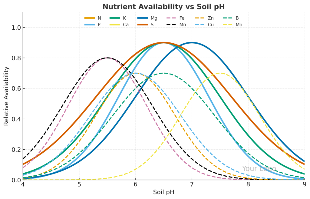 Soil pH strongly controls nutrient availability and plant health. In acidic soils, phosphorus and molybdenum become deficient, while toxic levels of aluminum and manganese may appear. In alkaline soils, iron, zinc, and manganese deficiencies are common, leading to chlorosis and reduced growth.