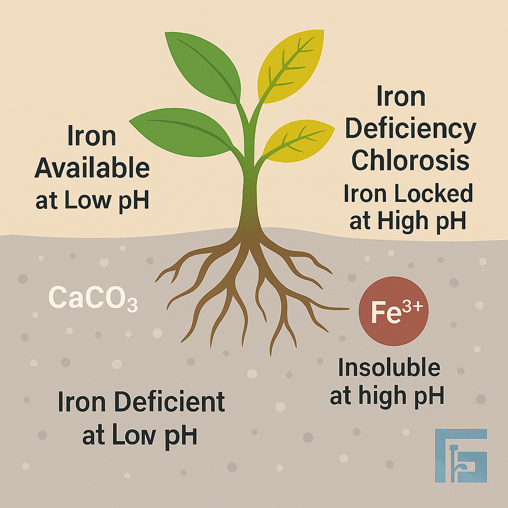 In calcareous soils with high pH and lime content, iron (Fe) becomes insoluble and unavailable to plants. This results in interveinal chlorosis, where leaves turn yellow while veins remain green. Iron deficiency is one of the most widespread nutrient disorders in crops grown on alkaline soils.