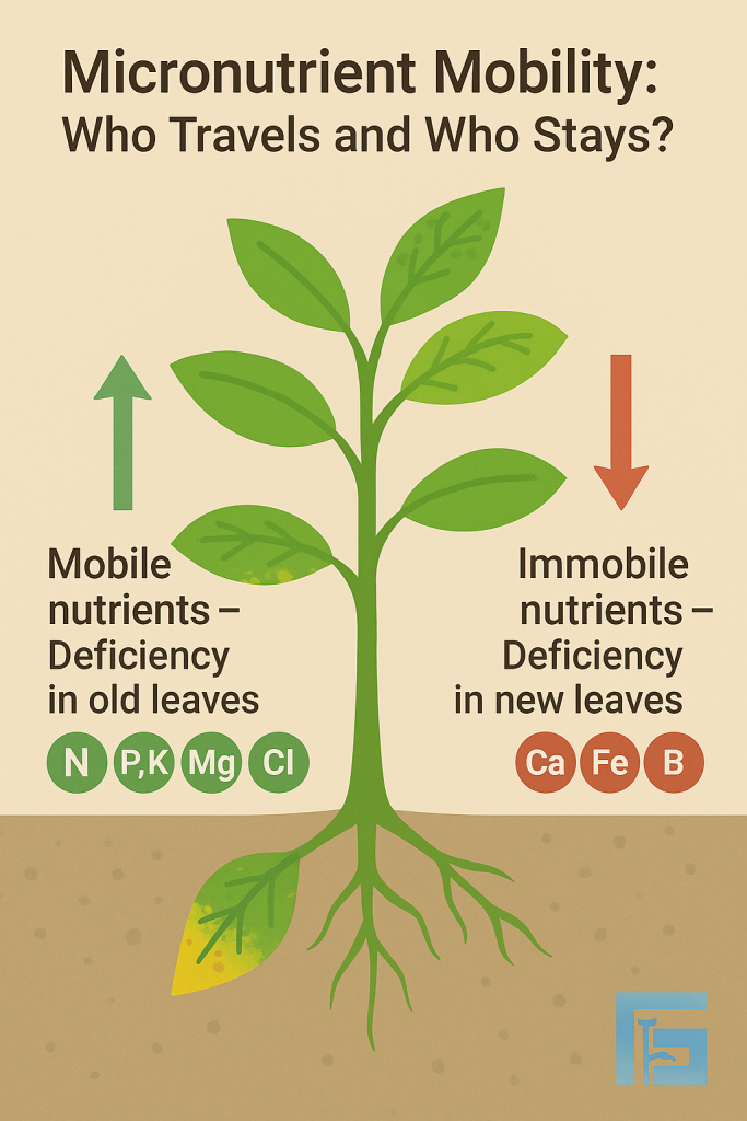 Nutrient mobility in plants determines where deficiency symptoms first appear. Mobile nutrients (like N, P, K, Mg, Cl) move to young leaves, so deficiencies show up in older leaves. Immobile nutrients (like Ca, Fe, B) remain in young tissues, making deficiency symptoms visible in new growth.