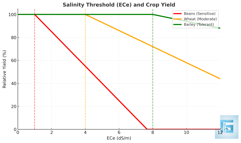 Each crop has a salinity threshold (ECe, dS/m) below which yield remains unaffected. Beyond this threshold, yield decreases proportionally with increasing soil salinity. Salt-sensitive crops like beans decline quickly, while tolerant crops like barley sustain production under higher ECe values.