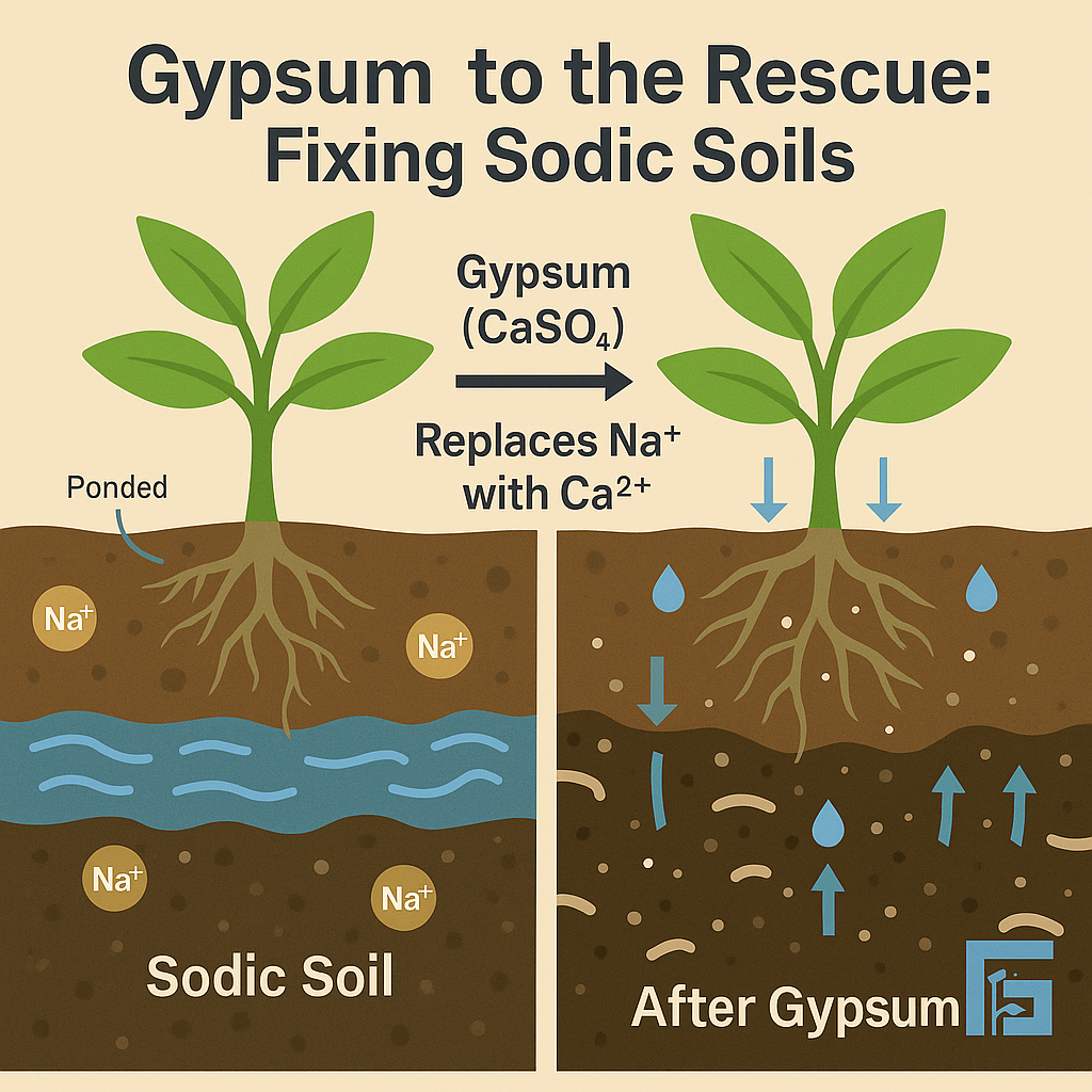Sodic soils, dominated by sodium (Na⁺), suffer from poor structure, dispersion, and low infiltration. Applying gypsum (CaSO₄·2H₂O) replaces sodium with calcium, flocculating soil particles and restoring porosity. This amendment is a practical solution to reclaim sodic soils for sustainable farming.