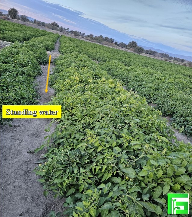 In some fields, inadequate land leveling leads to water accumulation at the base of the plant for prolonged periods. This condition (poor drainage) causes the young leaves to develop chlorosis, beginning from the petiole.